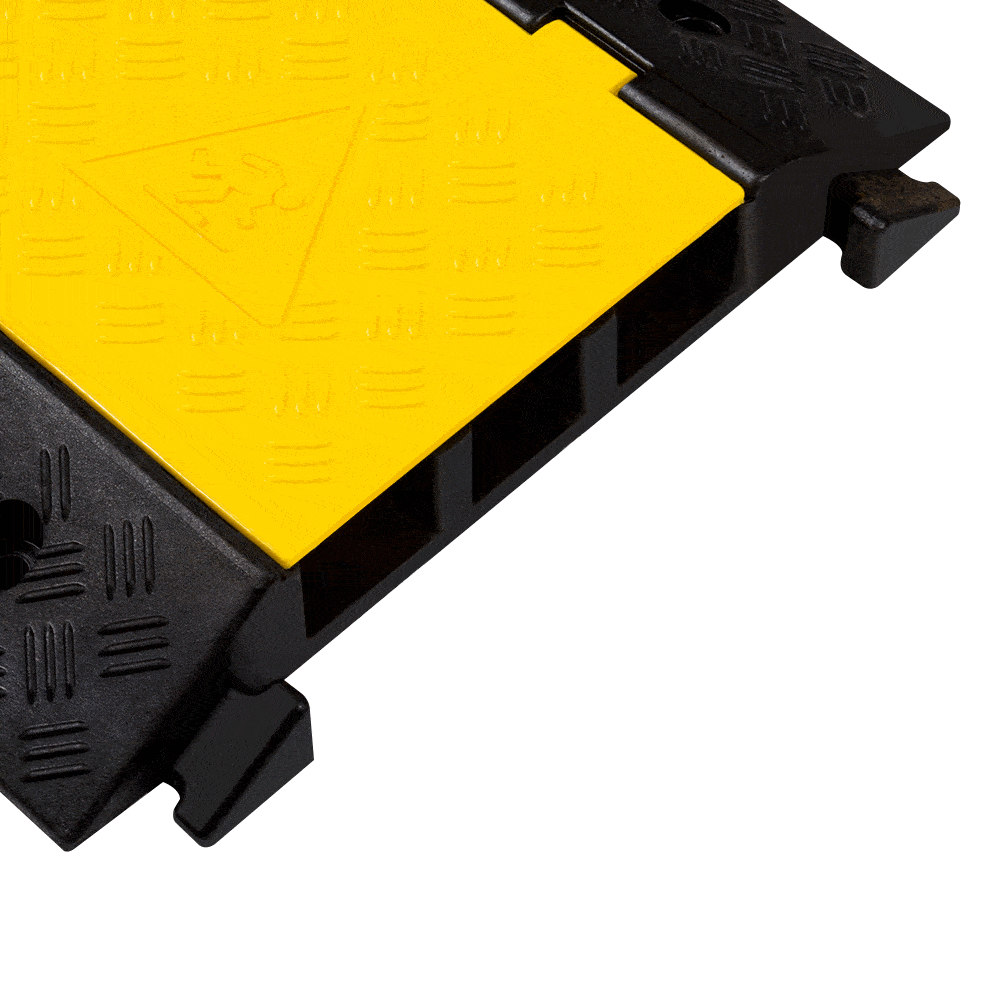 Mit der gelb/schwarzen 3-Kanal Kabelbrücke KB3 werden auf dem Boden liegende Kabel, Schläuche oder Leitungen mit bis zu Ø 5 cm sicher vor Schäden durch Überfahren und Überlaufen geschützt. Das 90 x 50 x 7 cm große Brückenmodul zum Aufklappen verfügt einen integrierten Tragegriff und kann dank der Modulbauweise individuell erweitert werden.